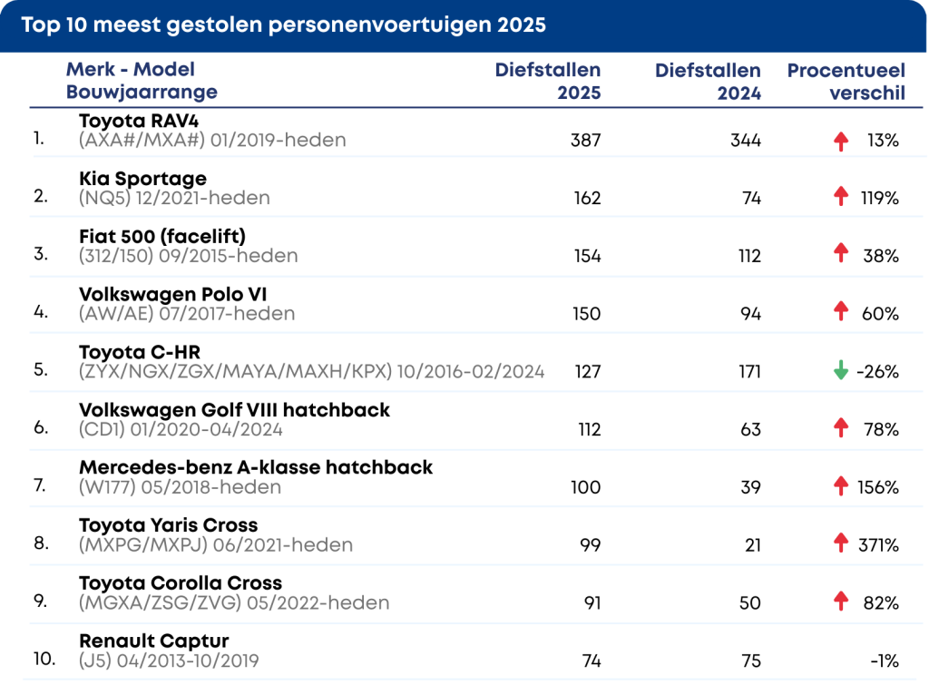 De Toyota RAV4 (bouwjaar 2019–heden) blijft het meest gewilde doelwit met 387 diefstallen (+13%). Opvallend is de sterke stijging bij de Kia Sportage (2021–heden), waar het aantal diefstallen met 119% toenam. Ook de Fiat 500, Volkswagen Polo en Toyota C-HR staan hoog op de lijst.