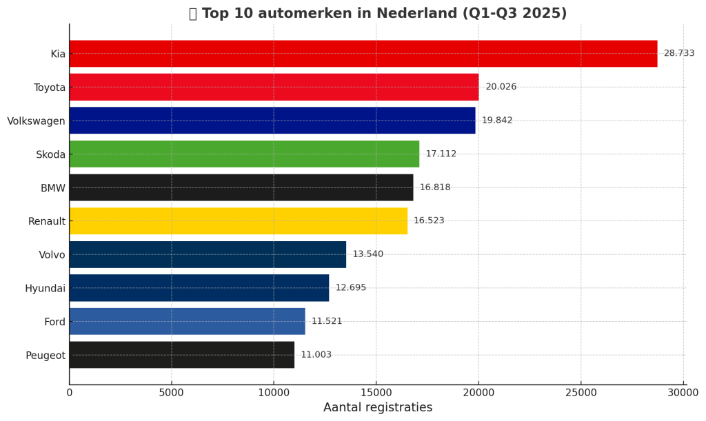Van januari tot en met september 2025 werden er 28.733 nieuwe Kia’s geregistreerd, goed voor ruim tien procent van de markt. Daarmee is Kia overtuigend marktleider. Toyota volgt op ruime afstand met 20.026 registraties, een daling van ruim twaalf procent ten opzichte van vorig jaar. Volkswagen maakt daarentegen een sterke opmars en noteert met 19.842 registraties een groei van meer dan twintig procent ten opzichte van een jaar eerder. De top vijf wordt gecompleteerd door Skoda (17.112, +18%) en BMW (16.818, +4%).