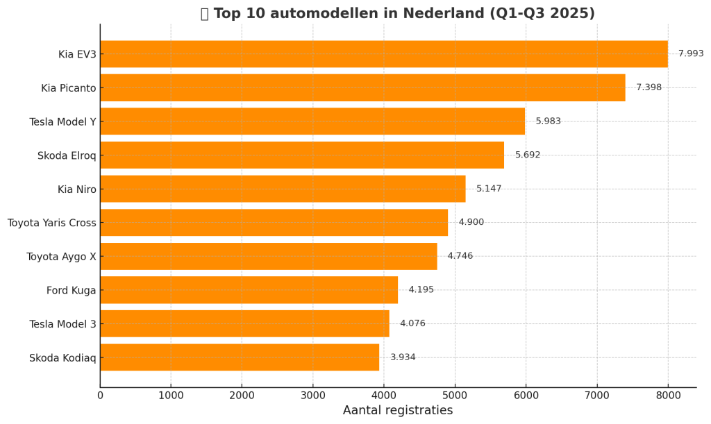 Niet alleen als merk domineert Kia, ook in de modellenranglijst voert het de boventoon. De volledig elektrische Kia EV3 is met bijna 8.000 registraties de populairste nieuwe auto van Nederland – ongeacht aandrijving. Ter vergelijking: er zijn dit jaar meer EV3’s op kenteken gezet dan álle Opels samen.