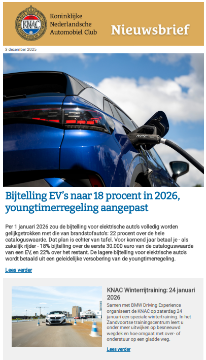 Altijd op de hoogte blijven van het autonieuws en komende evenementen? Abonneer u dan nu op de KNAC Nieuwsbrief. Deze verschijnt circa zes keer per jaar en is gratis en vrijblijvend. Het enige dat u hoeft te doen is uw naam en e-mailadres opgeven. Uiteraard kunt u de Nieuwsbrief op elk moment weer opzeggen.
