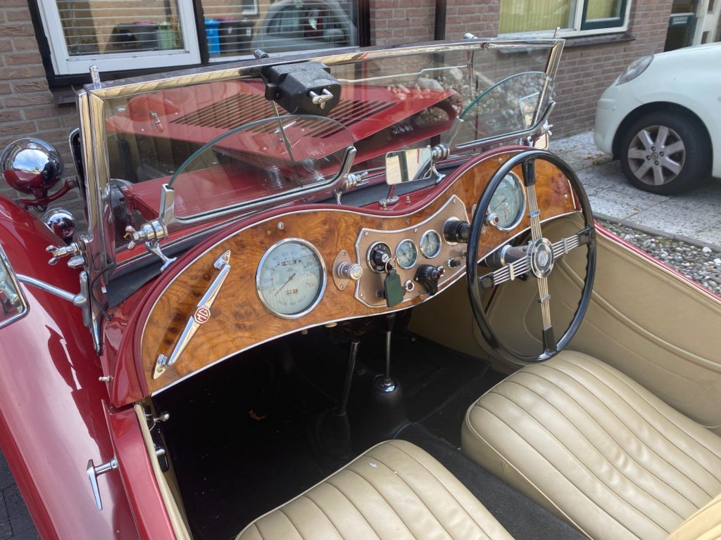 Een mooie MG TC met vele extra’s: gemodificeerd VW kever stuurhuis (oude aanwezig), notenhouten dashboard (oude aanwezig), chrome spaakwielen, Alfin-remtrommels voor en achter (oude aanwezig). Prijs in overleg.